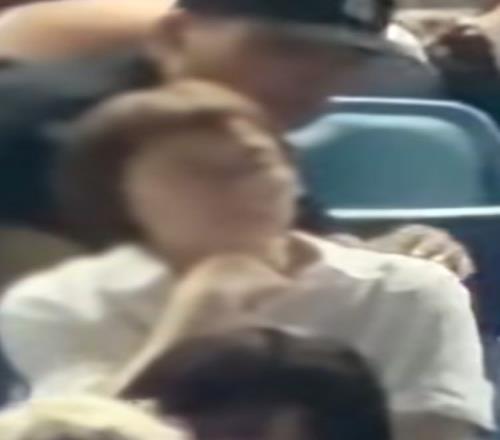 视频显示,一名女子在看台上多次发出尖叫声,并做出挑衅动作。后来,多名安保人员上前将其控制,她仍在尖叫挣扎,甚至摆出“剪刀手”,最终被抬出看台。