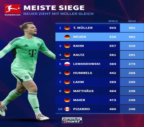 第362场胜利!诺伊尔追平由穆勒保持的德甲最多胜场纪录