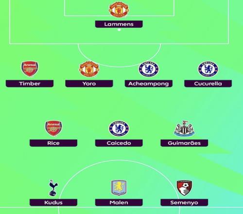 雷速体育10月6日宣 英超第7轮战罢,英超官方公布了阿兰·希勒评选的第7轮最佳阵容,切尔西有三名球员入选,曼联、阿森纳则各有两员。