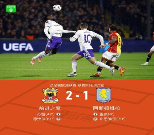 北京时间10月24日欧足联欧洲联赛 联赛阶段 第3轮,前进之鹰对阵阿斯顿维拉。上半场盖桑开场闪击,半场尾声特维特开出任意球,苏雷折射破门扳平比分。下半场约里斯-克拉默助攻德伊尔破门反超比分,之后布恩迪亚将点球踢飞。最终维拉客场1-2不敌前进之鹰。