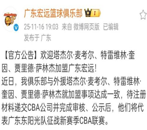 正式官宣!CBA争议外援加盟广东宏远,携手徐杰,冲击总冠军