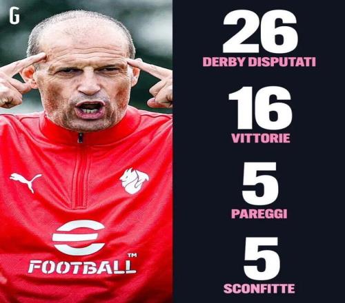 据米兰体育报数据统计,米兰主帅阿莱格里此前共26次带队出战米兰德比(米兰)以及都灵德比(尤文),战绩为16胜5平5负。