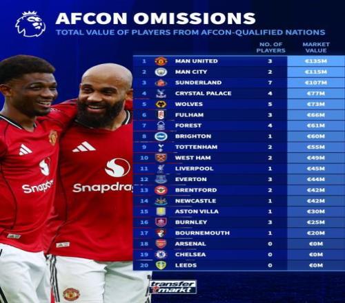 德转列英超各队非洲杯晋级国家球员总身价:曼联第1,曼城第2